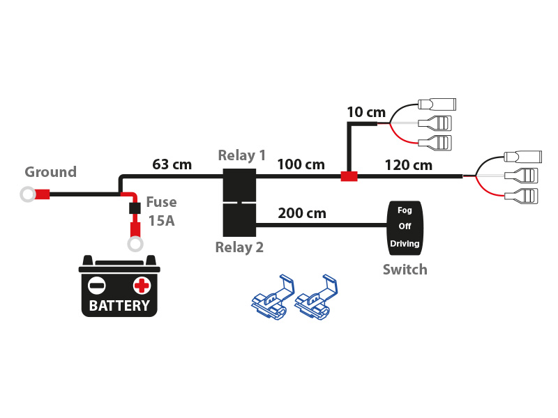 Sumu- ja kaukovaloille, vaihtokytkin + 2 x 12V 40A rele + johtosarja max 300W