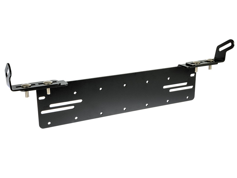 Säädettävä lisävaloteline EU- rekisterikilven taakse 510-565mm, Sisältää yhden telineen, säätöpalat (2kpl), telineen kiinnitysruuvit (10kpl) sekä säätöpalojen kiinnitystarvikkeet: pultit (4kpl), prikat (4kpl), mutterit (4kpl).